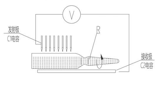 在样品两侧分别连接发射极和接收极,由检测电源提供的、经过设定的检测高电压,引导至发射极。当检测不漏的样品时,两个电极之间的电容值较大(因瓶壁的隔断,电极不能和药液接触,故产生电容),产生感应微电流较小;当检测有泄露的样品(瓶口处、瓶底、瓶身存在漏隙,破损),绝缘瓶壁和电极之间的电容消失,发射级与接收级之间形成回路,此时检测的微电流较大。只要比较微电流的大小,就可判断样品是否泄漏。将每支药品电流值的最大值与设置限值进行对比,如大于等于设置限值,系统即判为不合格,否则为合格。